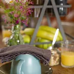 Die Gäste genießen ein einfaches Frühstück mit Pancakes und frischem Obst.